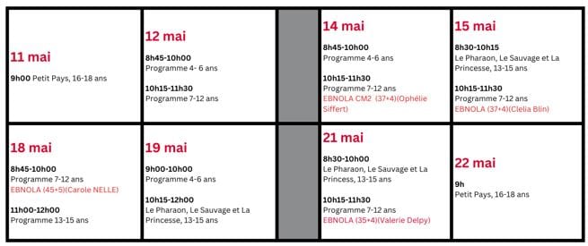 · Dates des projections : 11, 12, 14, 15, 18, 19, 21 et 22 mai entre 8h30 et 11h30
